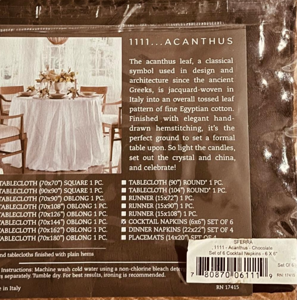 Sferra Acanthus Chocolate Brown Cocktail Napkins 6 PC. Egyptian Cotton 6x6" New