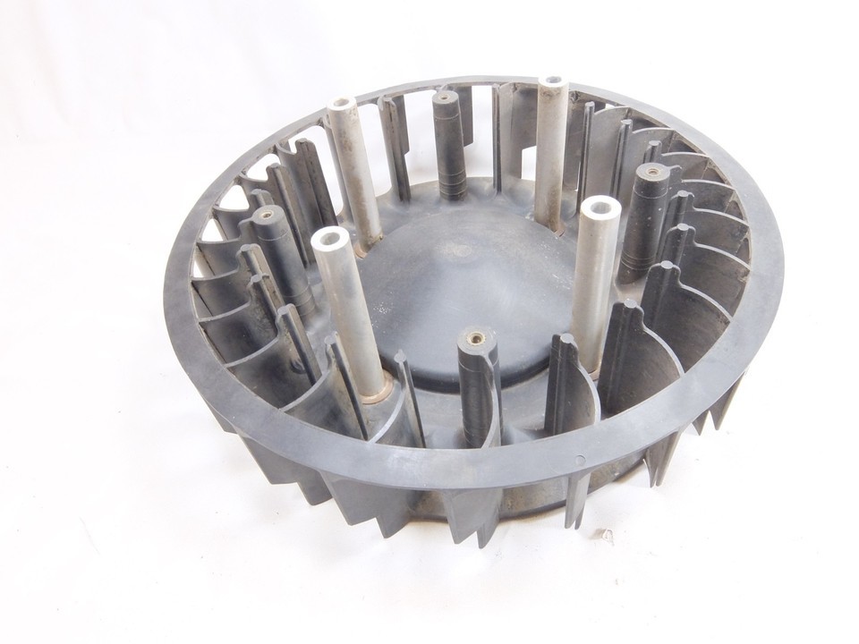 This is a used genuine flywheel fan and screen that was removed from the mower below. This offer includes the fan, the screen, the spacers, the ring support, and the long mounting bolts as shone.