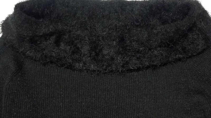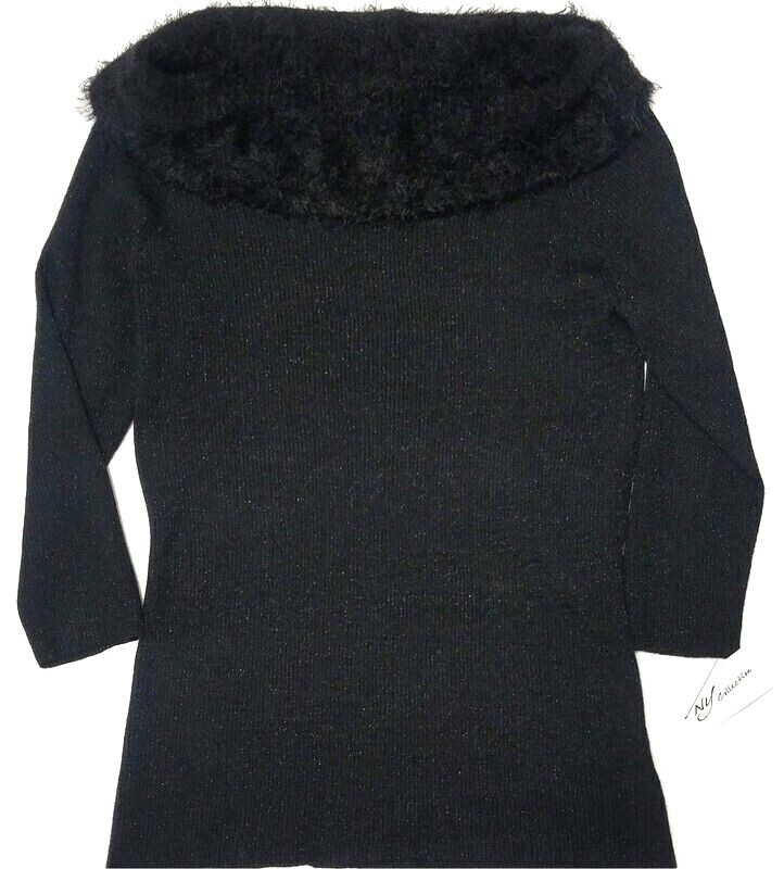 NY Collection Black Metallic Knit Sweater Faux Fur Collar 3/4 Sleeve Large NWT