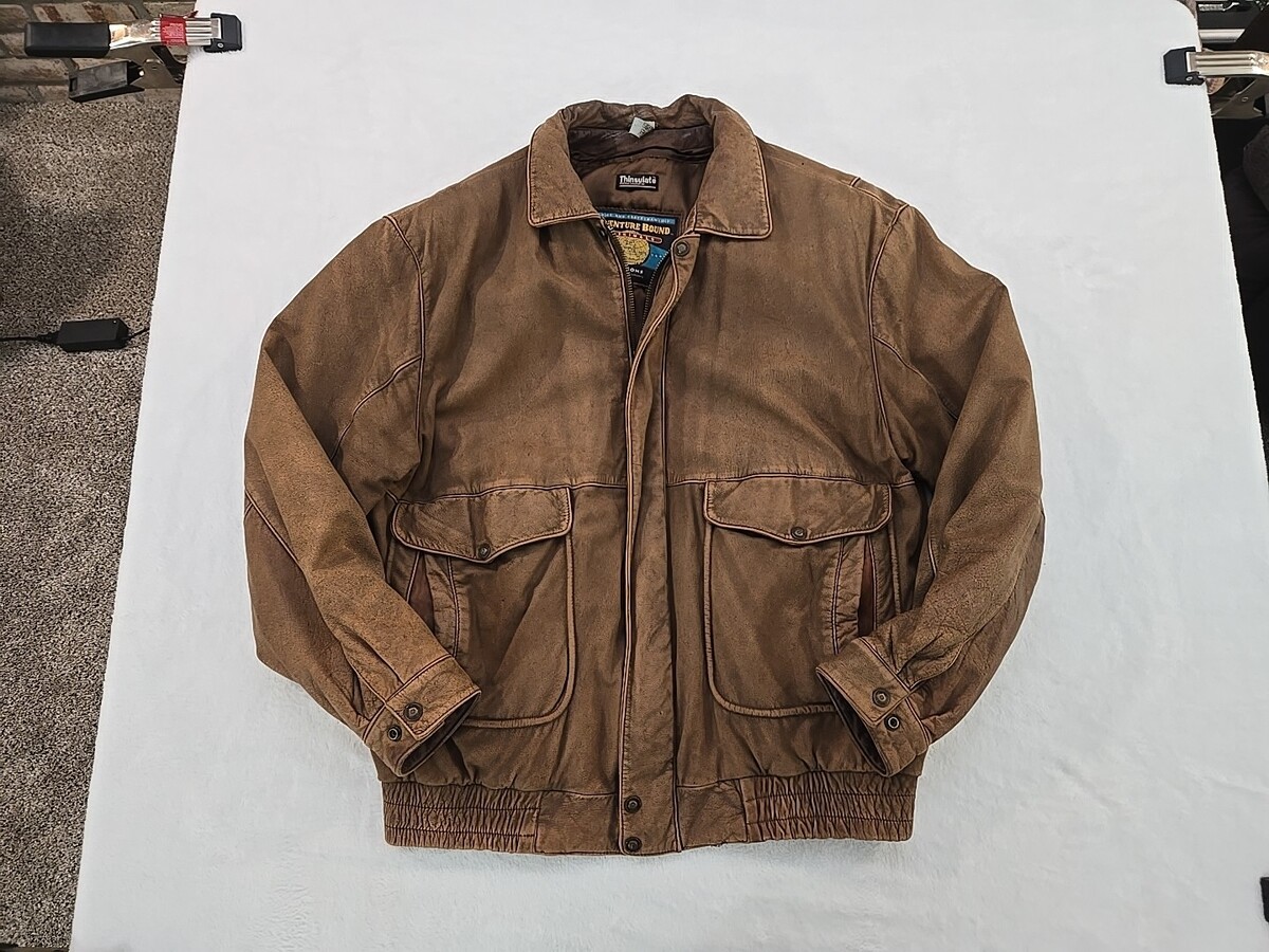 The Wilsons Adventure Bound Vtg 90s Thinsulate Leather Bomber Jacket in Mens Sz XL Tall is a stylish and classic outerwear option for men. Made with genuine leather and featuring a spread collar, full zip closure, and pockets, this mid-length bomber jacket is perfect for casual occasions in the winter, fall, or spring. The vintage design with a 90s theme adds a unique touch to the solid brown color, making it a standout piece in any man's wardrobe. Perfect for those looking for a relaxed fit in a big and tall size.