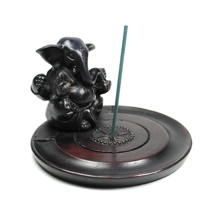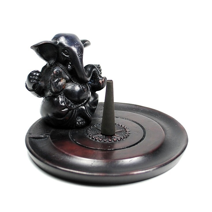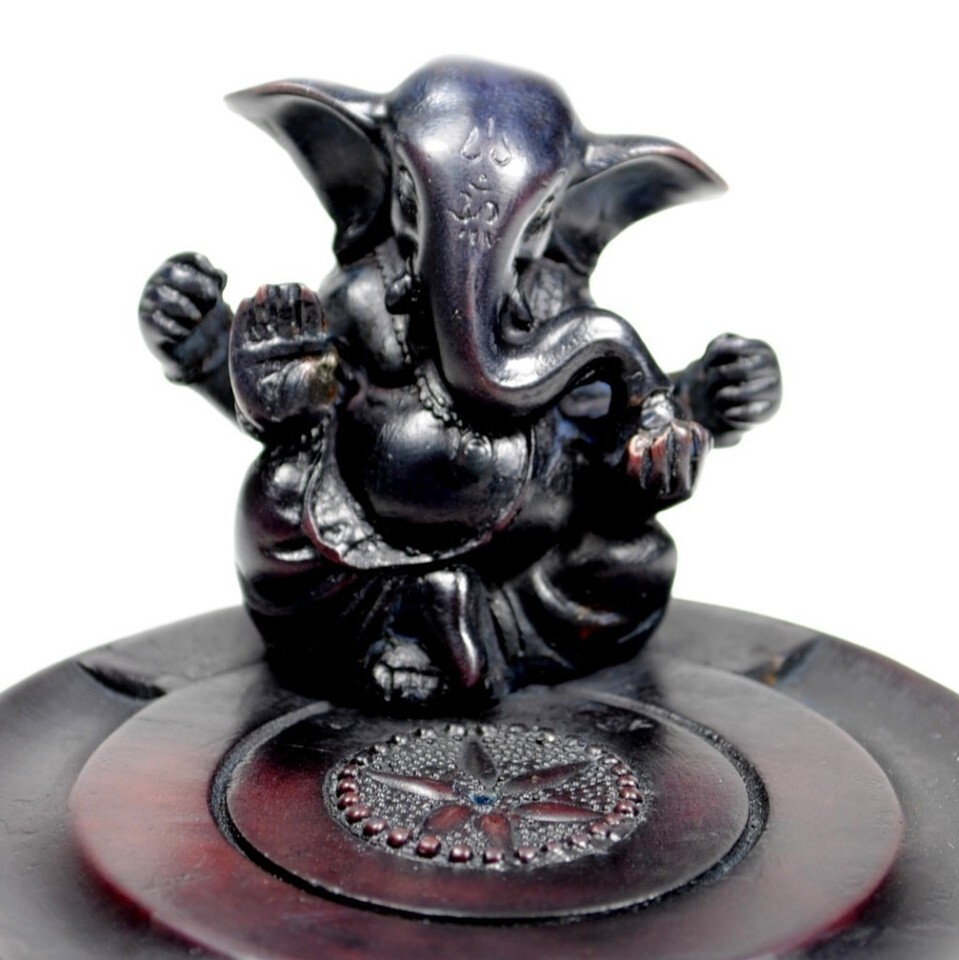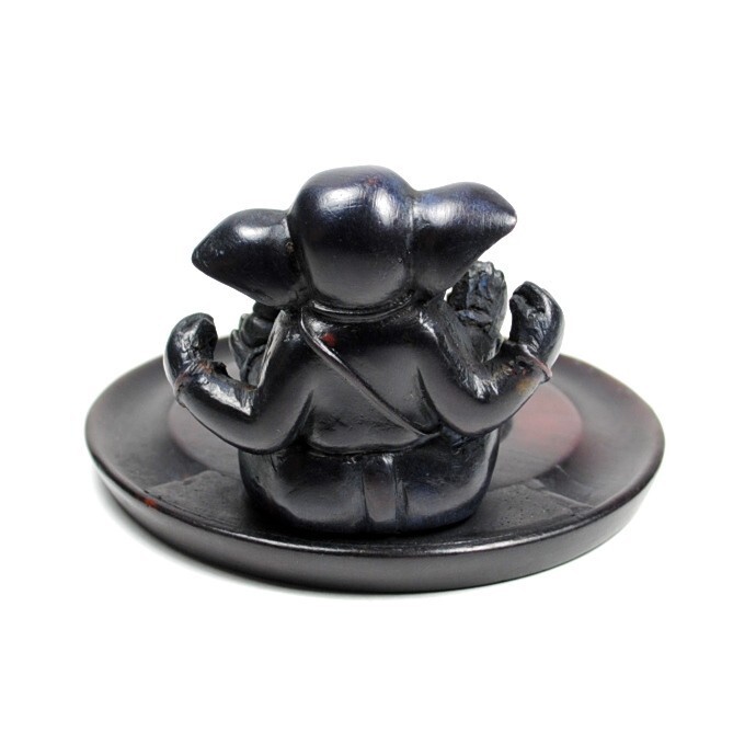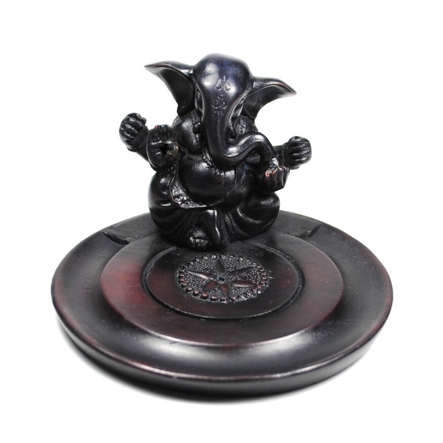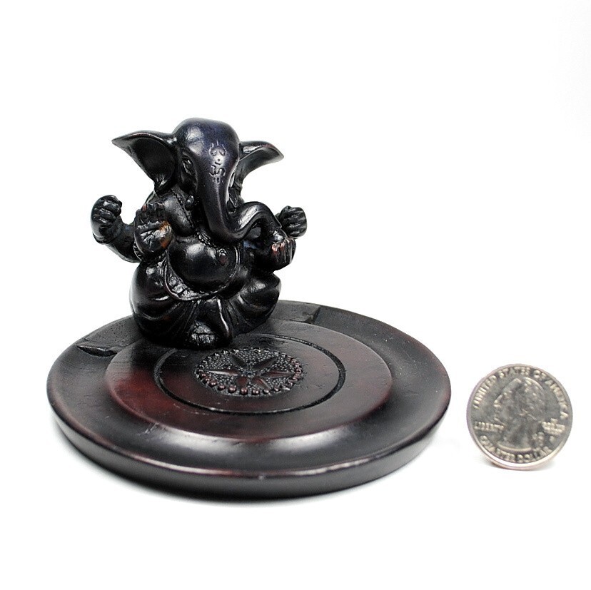 This cold cast resin plate incense burner features a small statue of Ganesha, the Hindu elephant god.