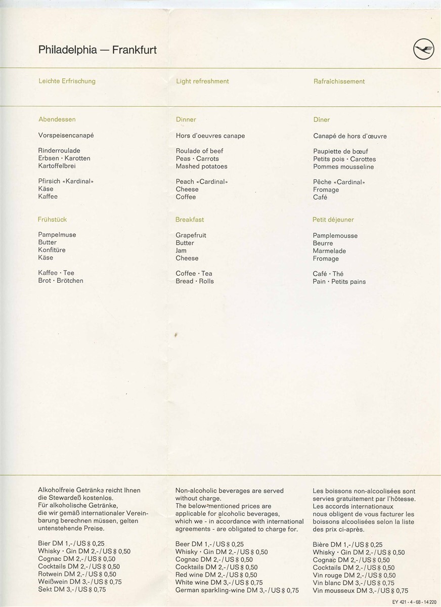 Lufthansa Airline Coach Class Menu 1968 Philadelphia Frankfurt