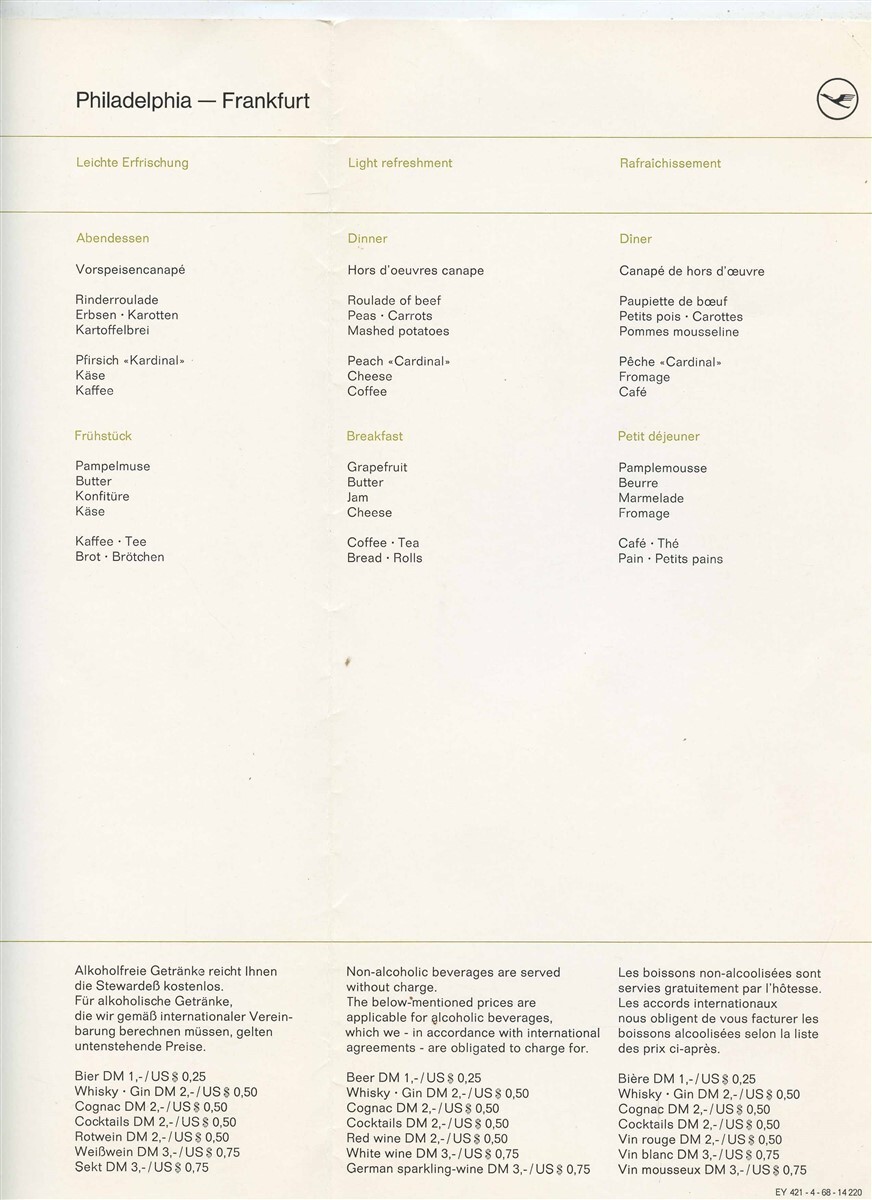 Lufthansa Airline Coach Class Menu 1968 Philadelphia to Frankfurt