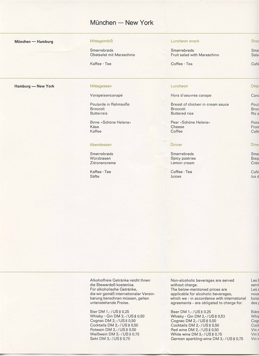 Lufthansa Airline Coach Class Menu 1968 Munich New York Pastry Coffee Cover