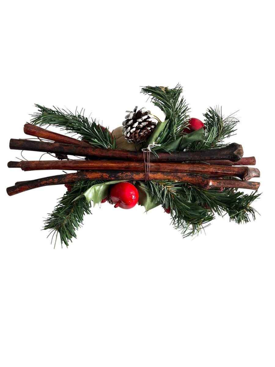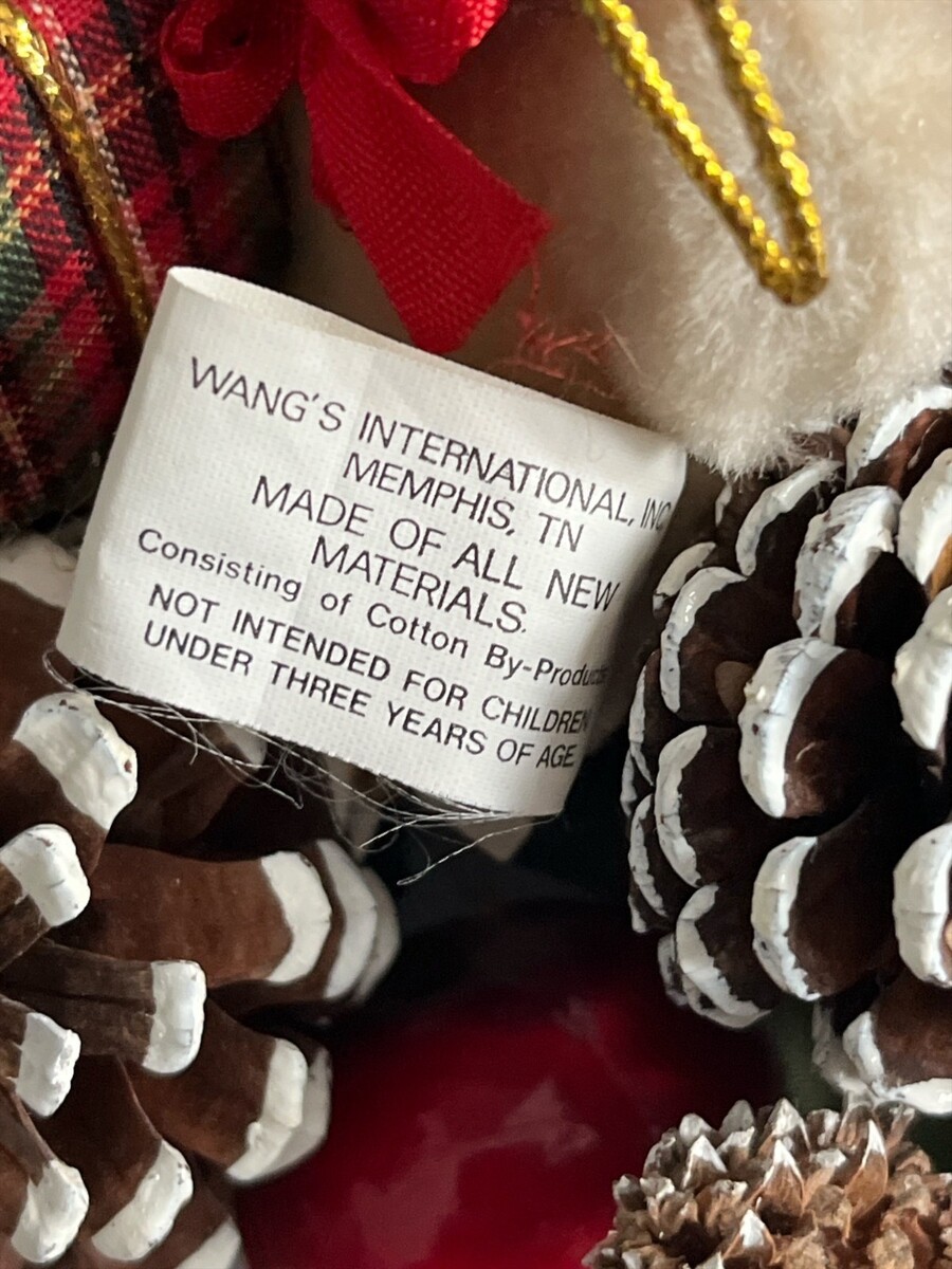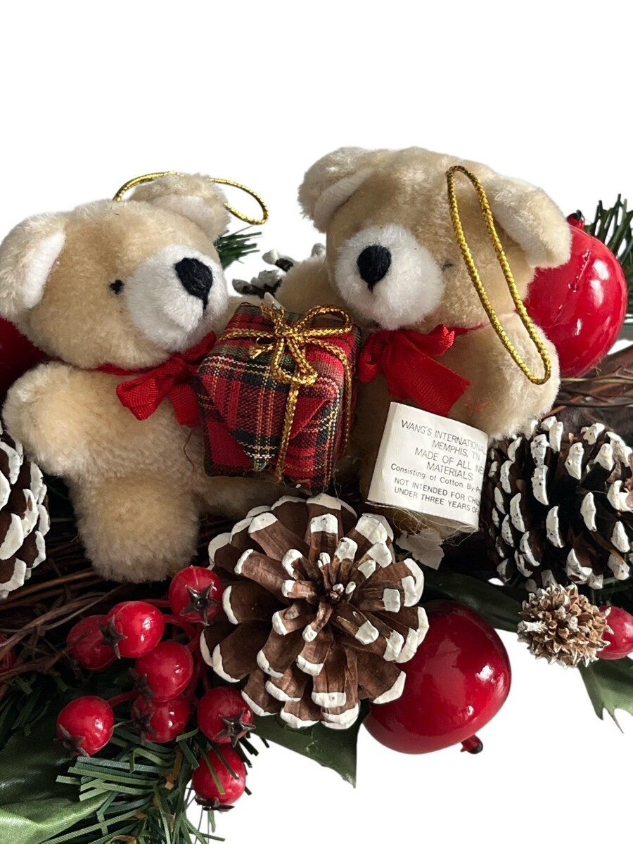 Vintage Christmas holiday centerpiece featuring two plush teddy bears holding a wrapped gift, surrounded by faux evergreen greenery, pinecones, red berries, and bundled decorative wood sticks. Both bears retain their original Wang?s International, Inc. tags from Memphis, Tennessee, noting construction from all new materials consisting of cotton by-products and indicating the item is not intended for children under three years of age. Designed for versatile display, this piece can be used as a tabletop centerpiece, mantel decoration, or hung as a festive wall or door accent.