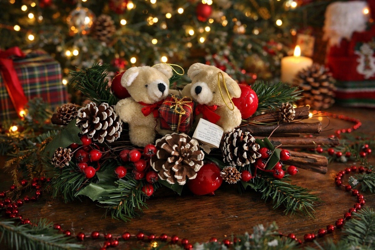 Good condition. Plush bears are clean with no rips or stains. Decorative elements are intact and securely attached. Light age-related wear consistent with seasonal use.
