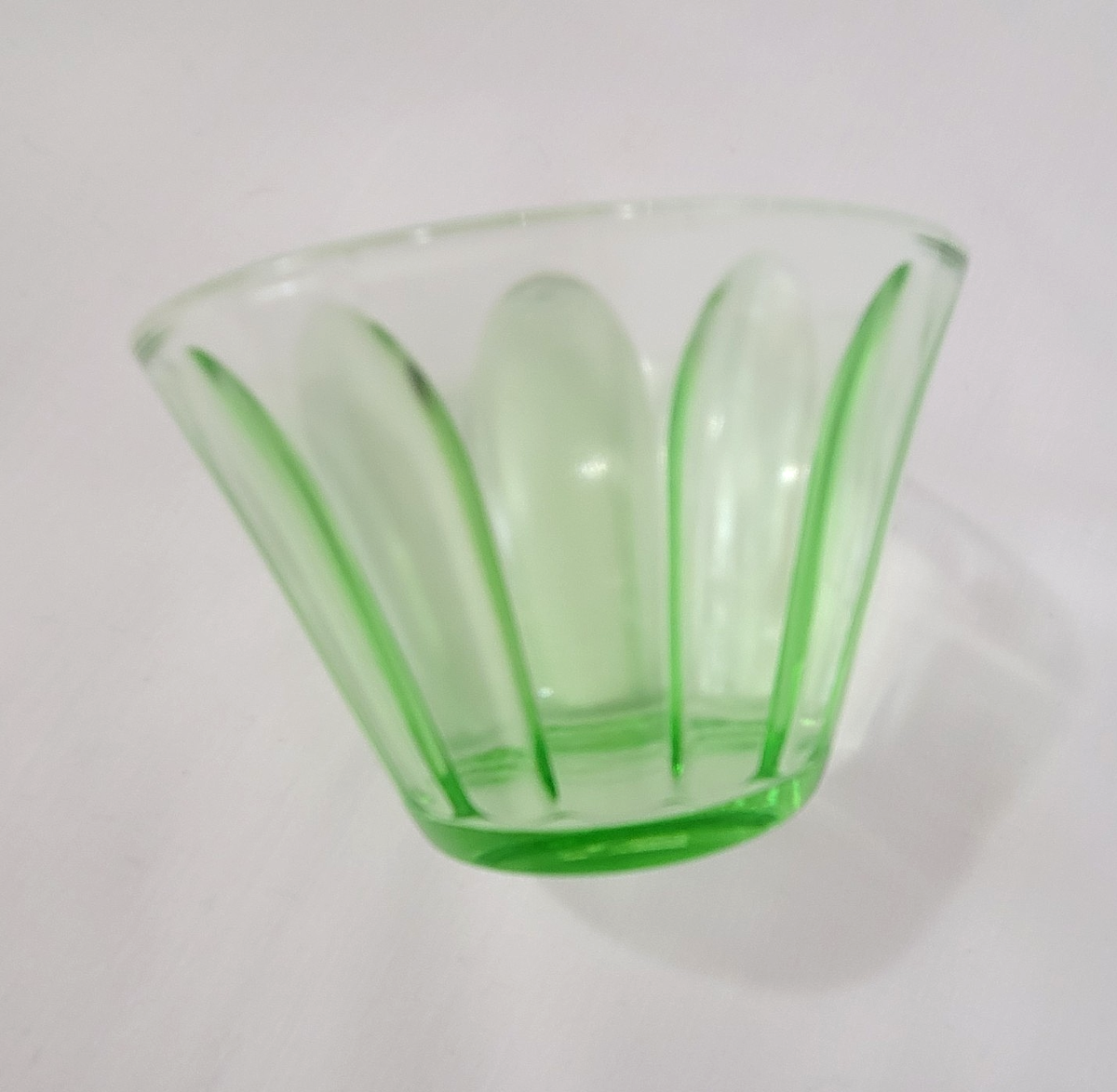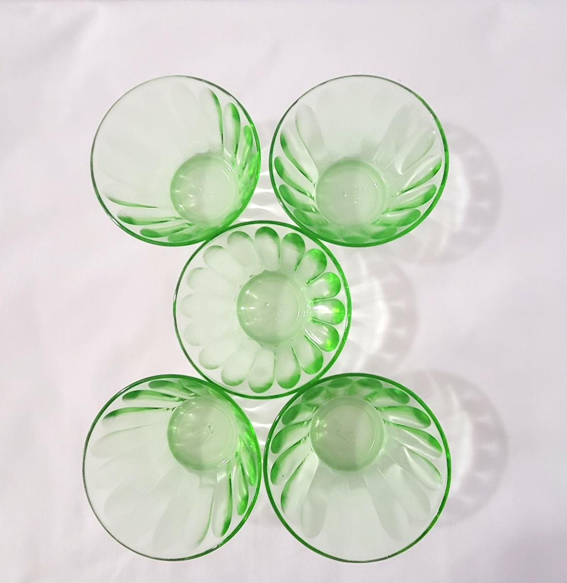 Beautiful to display or use --5 fluted custard / nut cups - uranium glass so able to glow