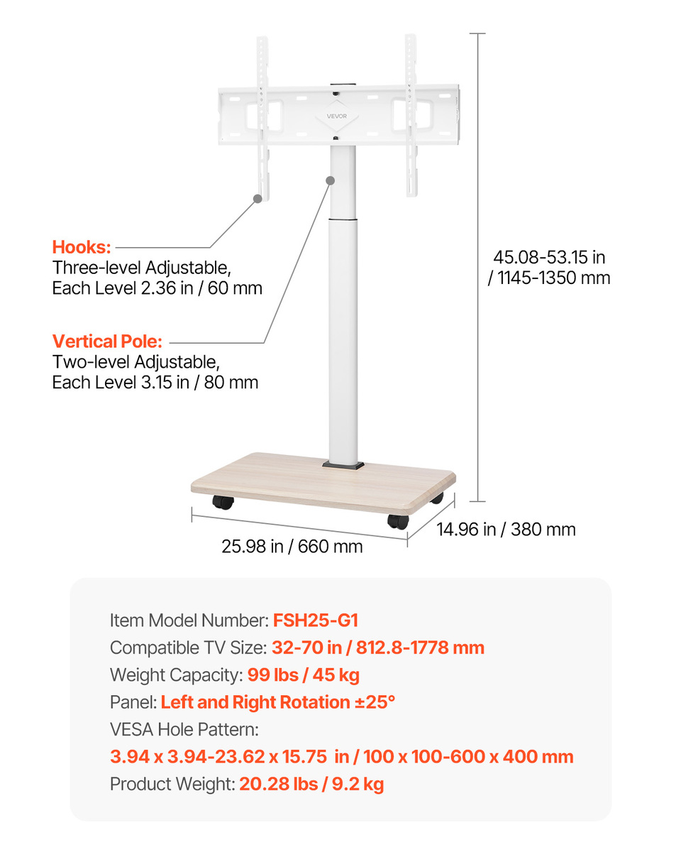 Flexible Adjustability: This movable TV stand provides height adjustment options, allowing you to easily set the TV at the ideal height based on your room layout and viewing needs. The 25 left-right rotation feature lets you rotate the TV freely for an ideal all-around viewing experience.