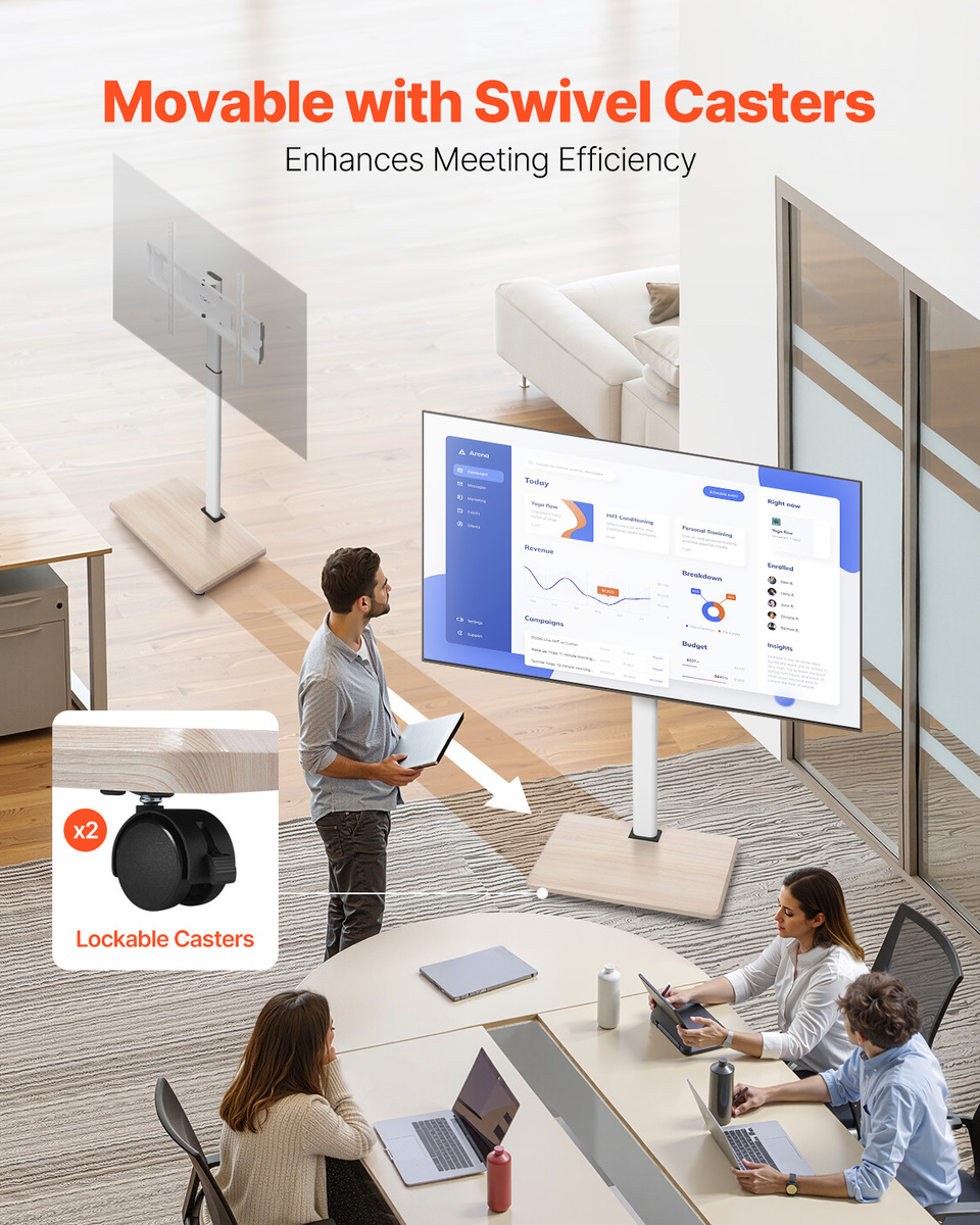 Convenient Mobility: Equipped with swivel wheels, this mobile TV mount allows you to effortlessly rotate to adjust angles or move it to your desired position. You can easily slide it to different spots in the room.