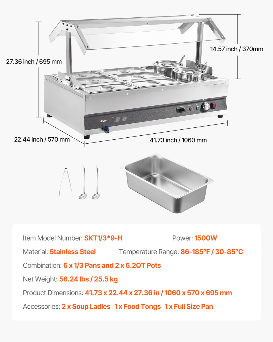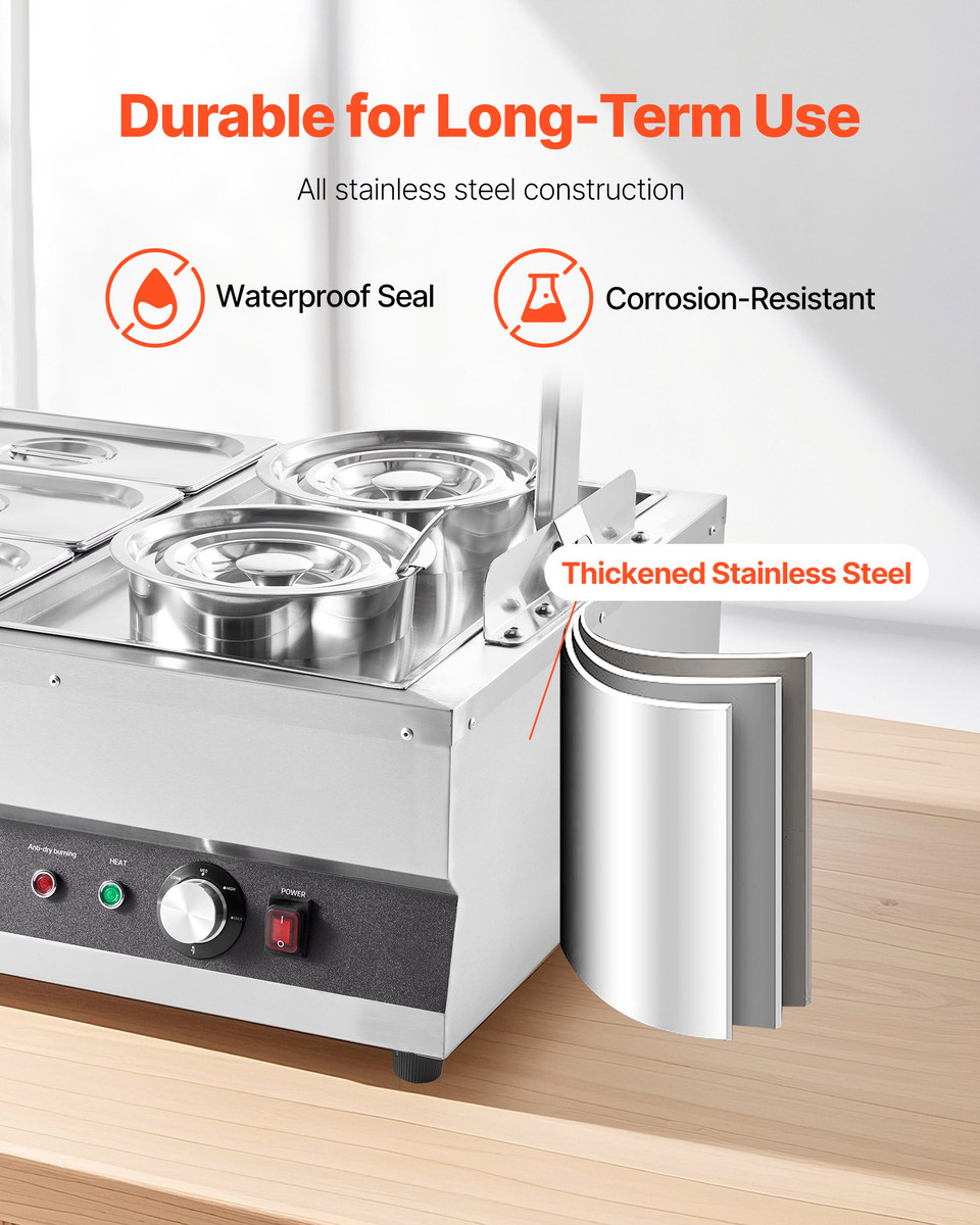 Durable for Long-term Use: Made entirely of stainless steel, this bain marie food warmer is corrosion-resistant, waterproof seal, and able to withstand the harsh kitchen environment, including exposure to grease and acidic or alkaline substances