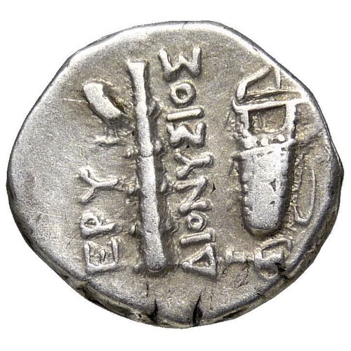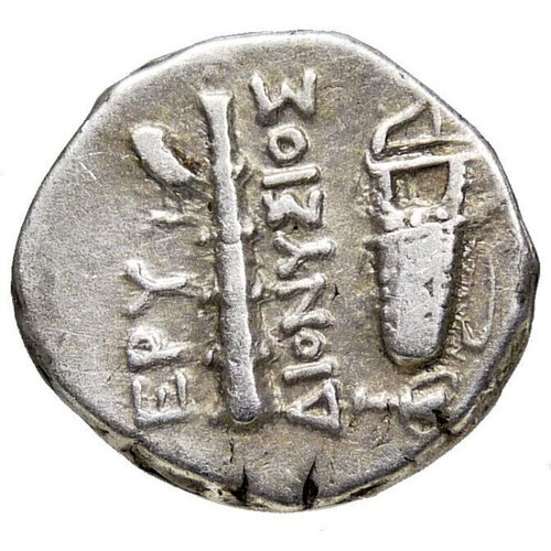 Reverse: EPY / ?IONY?IO? (Dionysios in Greek) Club and bowcase; to left, owl standing left, head facing; kantharos (footed drinking cup with high handnles) to lower right.