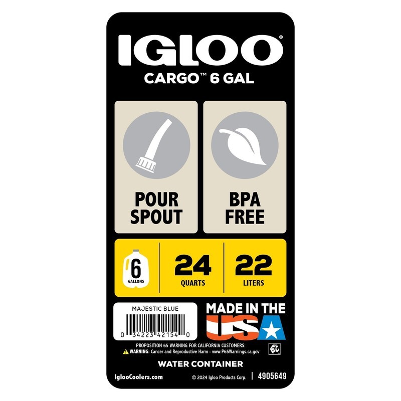 Stay hydrated no matter your location with the Igloo 6-Gallon Water Container in blue. Designed to be used in a rugged environment, or simply to be the just in case for a power outage, the molded-in top and side handles make pouring and carrying easy for all. The Igloo 6 Gallon Water Container spout conveniently stores inside the container when you aren't using it so it can stay clean. Train, camp, trek, or prepare with purpose!