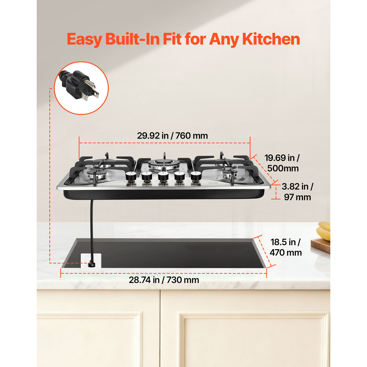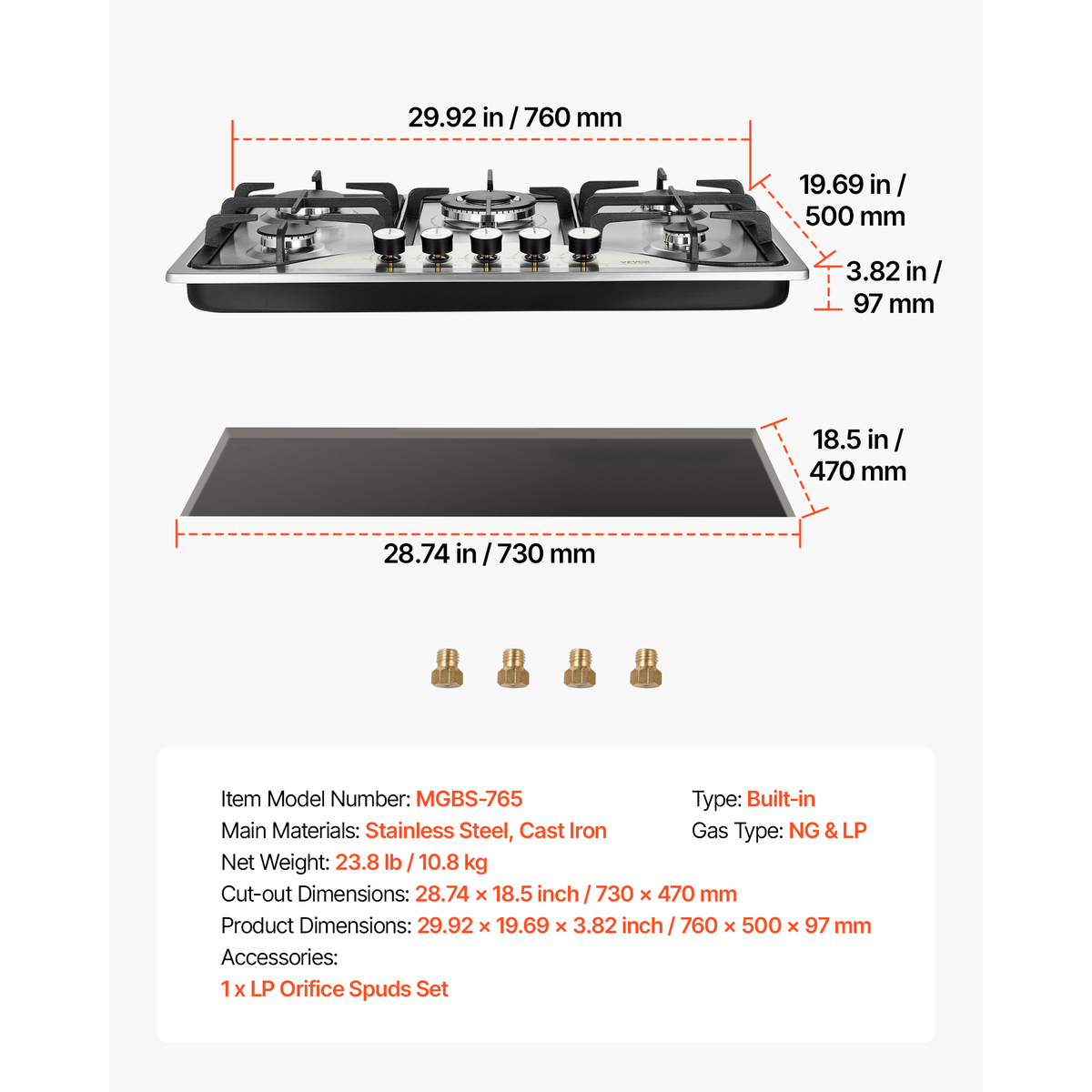 High Compatibility: The propane cooktop is equipped with LPG/NG convertible nozzles, allowing for flexible connection to either gas or natural gas supply. With a standard opening size of 28.7x18.5xR0.8 inches, it is designed to fit most kitchen installations. The versatility in fuel options and compatibility makes it suitable for a wide range of kitchen setups.