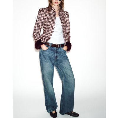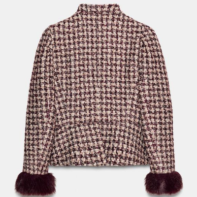 ZARA BNWT 2026. BUEGUNDY ECRU STRUCTURED TWEED BLAZER FAUX FUR CUFFS. 2289/649
