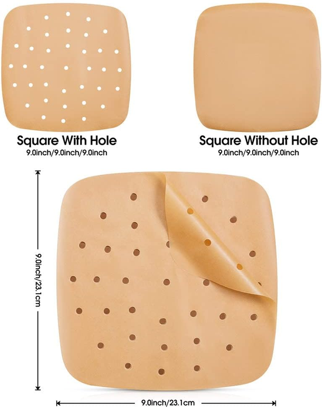 ?Air Fryer Liner Size?Our 9-inch square air fryer parchment paper liners are meticulously designed to snugly fit 9 to 10-inch square air fryers. But that's not all! They're also a great match for cake pans, microwave ovens, and conventional ovens. Even for 11 to 10-inch oval air fryers (measured by diagonal length) or 11-inch round air fryers and metal steamers, these liners adapt like a charm, ensuring versatility in your kitchen appliances.?