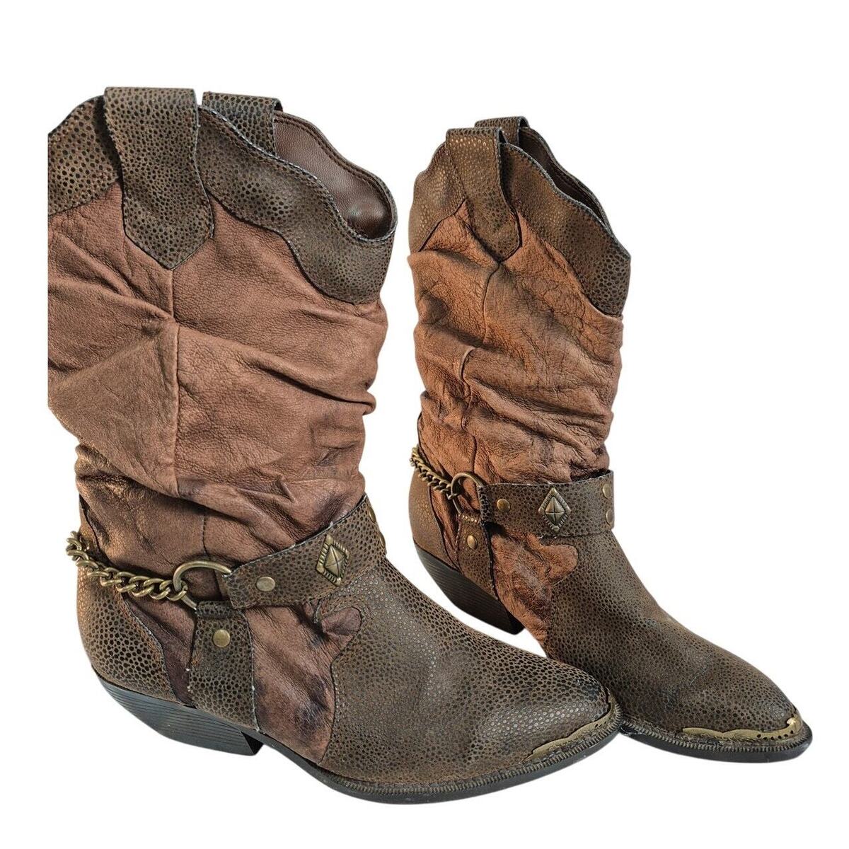 The Leather Collection Brown Western Coastal Cowgirl 2 Tone Leather Boots Sz 7.5 Brass Trim, women, in excellent condition.