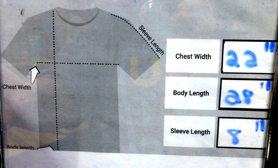 Measurements: Chest Width = 22", Body Length = 28", Sleeve Length = 8"