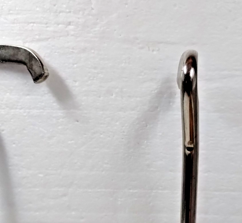 Wood Handles, Hooks are 6.5 Inches from bottom of Handles to bottom of Hook. Hooks and Handles are in Good Condition. 1 Set.