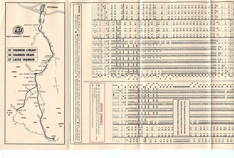 A 12 panel fold out for routes 35 Shannon Liberty, 36 Shannon Drake and 37 Castle Shannon. Has route map, schedules and more. Port Authority Transit Time Table Pittsburgh Pennsylvania , effective March 5, 1967. Folder PT-3g. Rail Rapid Serving the South Hills.