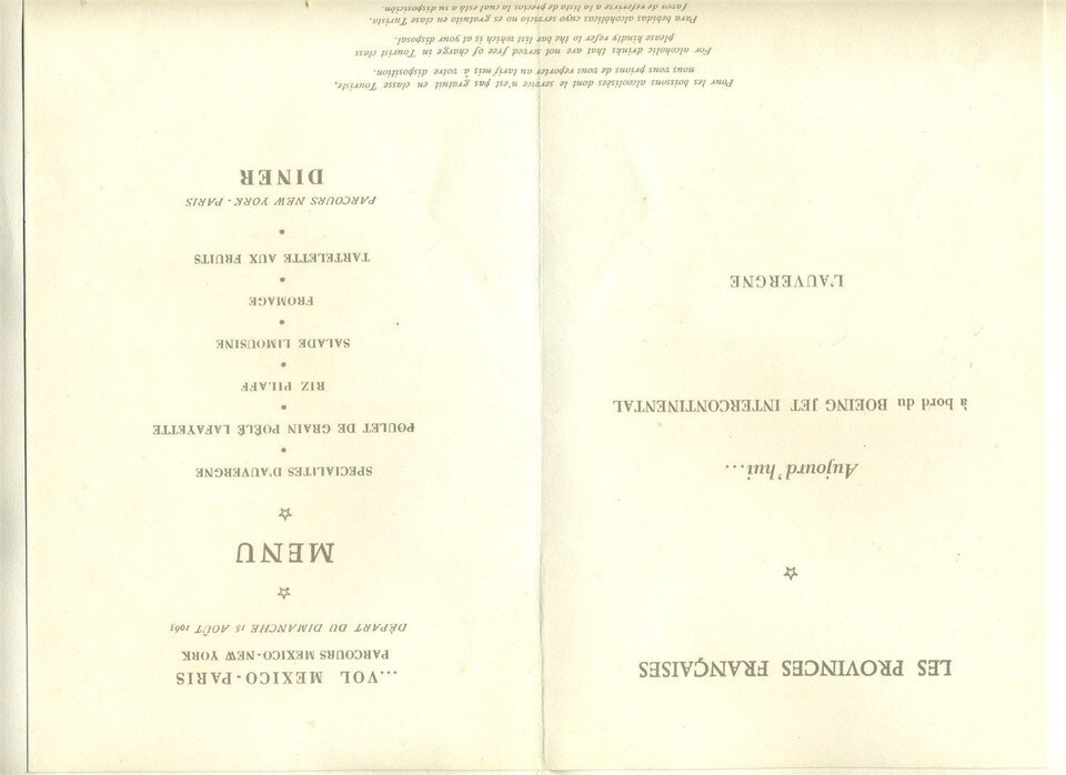 Air France Menu Mexico to JFK New York to Paris 1964 Boeing Jet