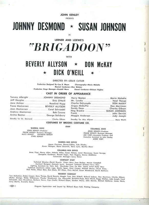 A souvenir program from a John Kenley production of Brigadoon. From a 1962 production that played in several Ohio cities. Starring Johnny Desmond, Susan Johnson, Don McKay, Beverly Allyson and Dick O'Neill. 8 pages filled with photos, biographies and more.