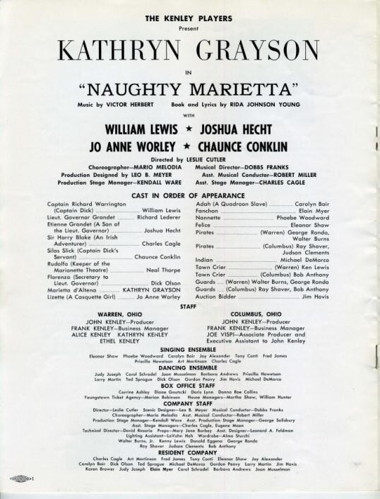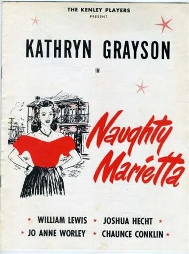 A souvenir program from a John Kenley production of Naughty Marietta From a 1961 production that played in several Ohio cities. Starring Kathryn Grayson, William Lewis, Joshua Hecht, Jo Anne Worley and Chaunce Conklin. 8 pages filled with photos, biographies and more.