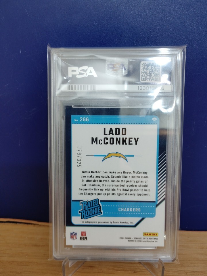 The product is a 2024 Panini Donruss Optic trading card featuring football player Ladd McConkey. This particular card is autographed by McConkey and has a limited edition number of 79 out of 325. It has been graded as a PSA 9, indicating it is in very good condition. This collectible item is a sought-after piece for fans and collectors of sports trading cards.