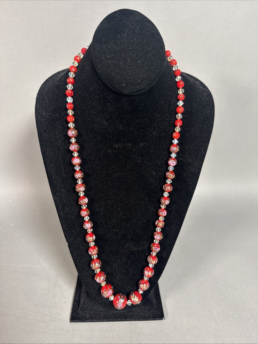 VTG red Venetian Art Glass Wedding Cake Bead Necklace Pink Rose Flower Rose