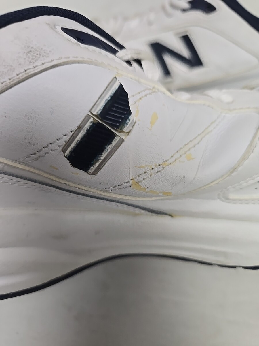 These New Balance sneakers are new and unworn, but may show minor signs of handling or storage, giving them a slightly ?tried-on? appearance. Please note there is a cosmetic defect where the ?N? logo is peeling (see photos for close-up details).