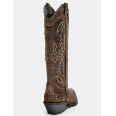Boot-style brown shoes in leather. Worn effect. Embroidered detail on the top. Double pull tab on the sides. Mid-heel. Pointed toe.