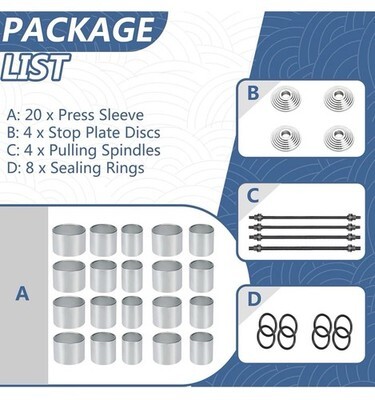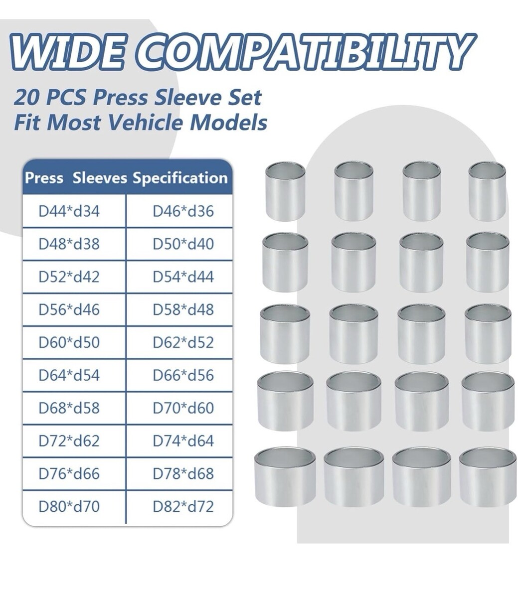 Our bushing press and pull kit provides 20 different sleeve sizes full range of sizes to fit various wrenches and drivers to meet various repair needs (Inside Diamete: from 34-72mm in 2mm steps;Outside Diameter: from 44-82mm in 2mm steps)