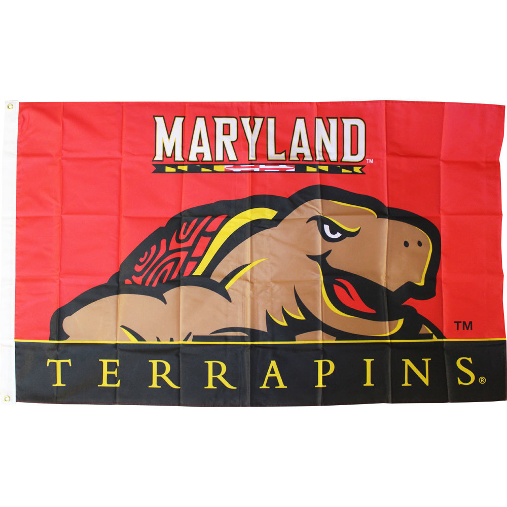 These full color Officially Licensed 3' x 5' University of Maryland flags are made of 150 denier polyester with an extra wide header and have two grommets on the 3 foot side for flying from a flagpole. To be used outdoors or as decoration indoors. The flags have been approved by Collegiate Licensed Products and the University.