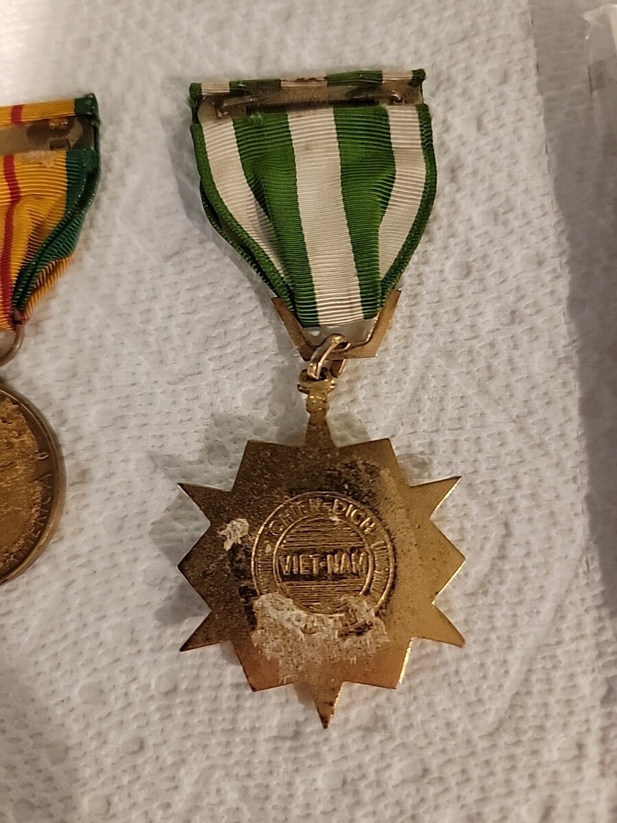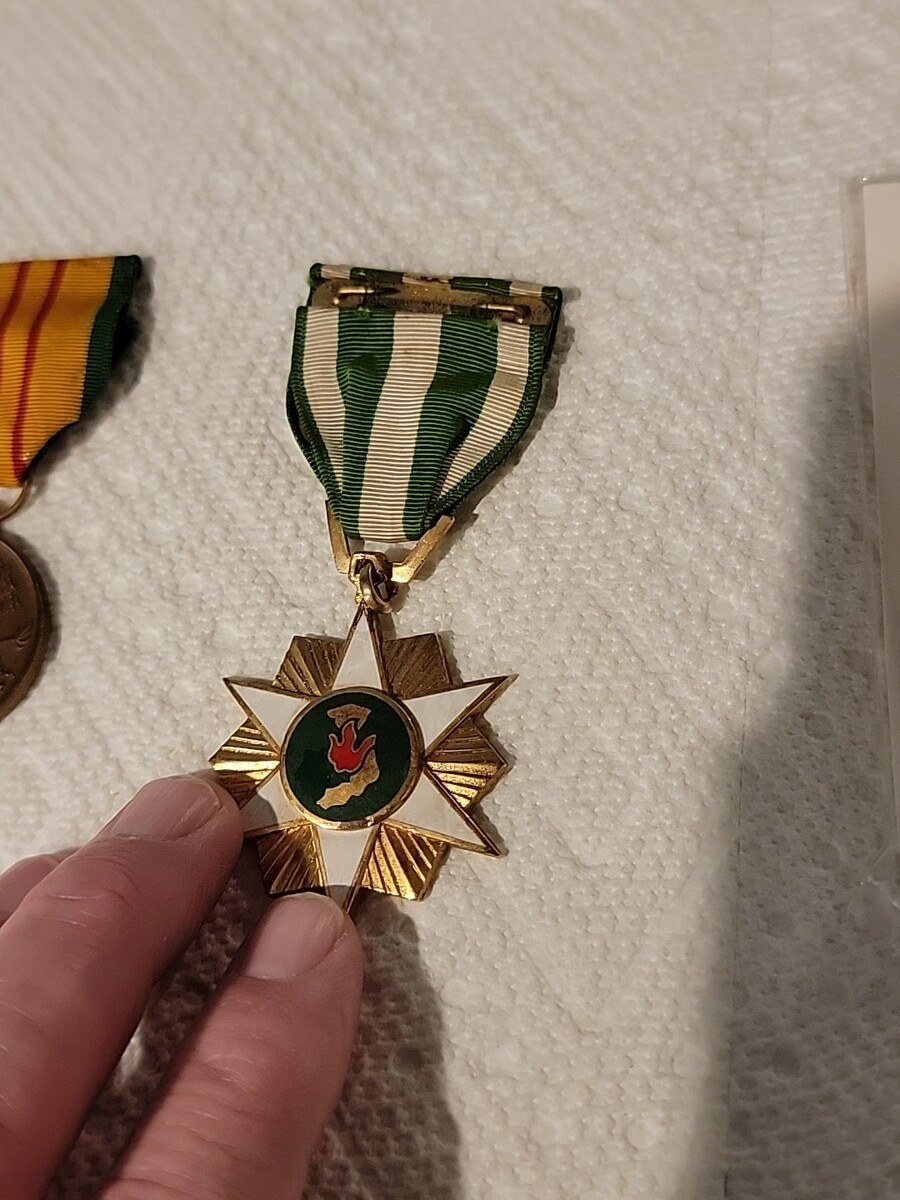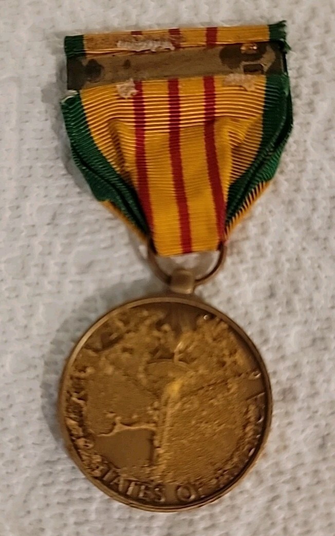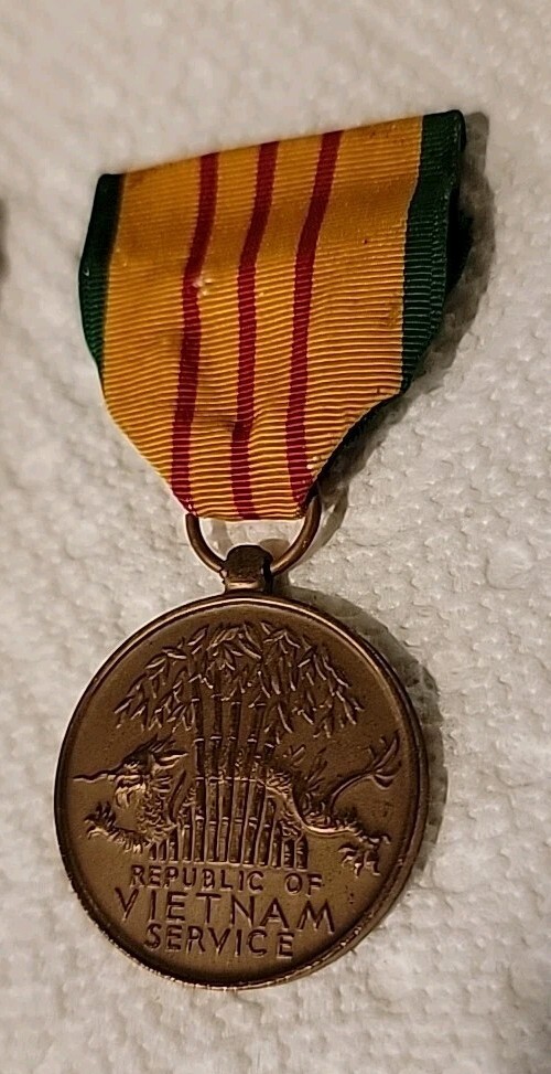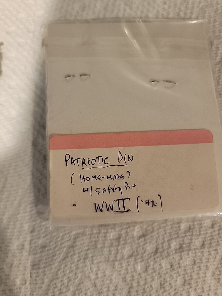 In overall good condition for age Republic of Vietnam service button has glue on the back that could come off with a little work and is missing the PIN the green Vietnam metal seems to be missing part of the pin in the back and has some staining on the cloth the homemade pin with the three colored Bells looks to be a little dirty but it is in plastic says World War II on the back but it may be World War I supposedly homemade by the women supporting the war.Also the pearl Harbor pin is in good condition and is sealed in a coin holder