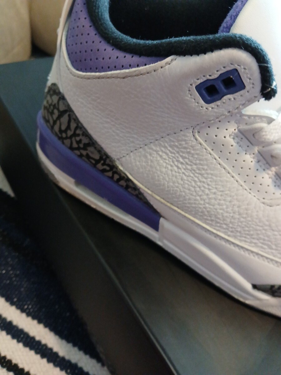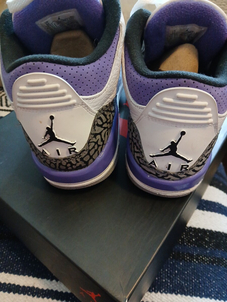 The Air Jordan 3 Retro (GS) in size 5Y features a mid-top design with a colorblock pattern in purple, perfect for activewear and casual occasions. Made with leather uppers and a rubber outsole, these sneakers offer comfort and breathability with a lace-up closure. Ideal for various activities like walking, school, skateboarding, and basketball, this 2020 release from Jordan is a stylish and versatile choice for teens looking for quality athletic shoes.