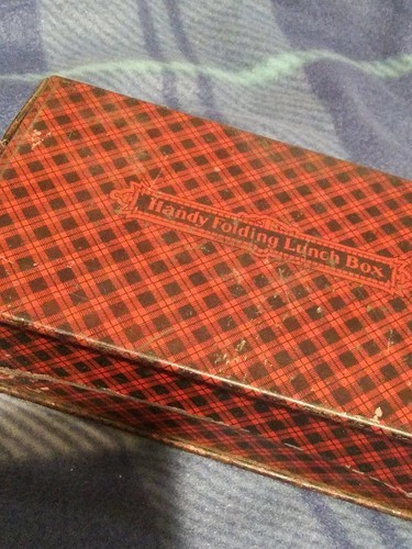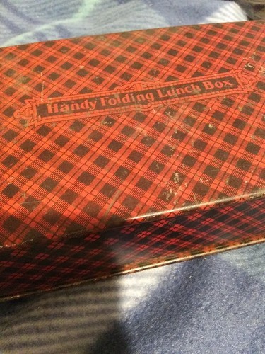 Featuring a unique folding design, this lunch box is both practical and stylish. It's a perfect addition to any collection of pre-1970 lunchboxes and thermoses, and a must-have for any collector of antique metal memorabilia. Don't miss your chance to own a piece of history with this remarkable vintage lunch box.