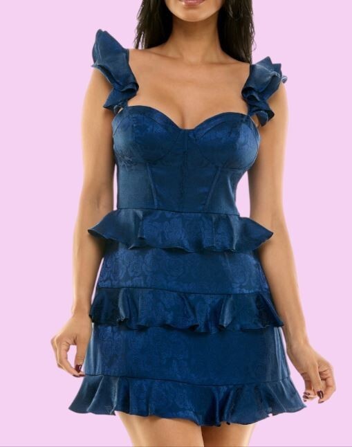 This charming B Darlin dress blends a youthful silhouette with a soft, feminine floral design. The sage?toned flower pattern stands out beautifully against the deep navy background, creating a look that?s both elegant and playful. The classic fit?and?flare shape highlights the waist and offers a flattering, comfortable fit perfect for parties, school events, or special occasions.