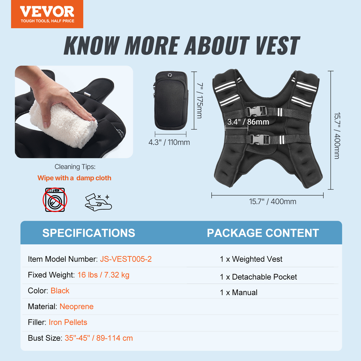 Personalized Fit: The double adjustable buckles cater to bust sizes ranging from 35" to 45" (89-114 cm), ensuring a perfect fit for all body types. This customization feature ensures that the weighted vest stays securely in place, providing support and stability during any activity.