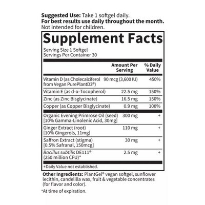 Expiration Date of 01/2026 ? Material: Softgels, offering a convenient and easy-to-swallow form for optimal supplement intake ? Product Formulation: Vegan, dairy-free, and time-release, ensuring hormonal balance and menstrual support for women ? Directions: Take 1 softgel daily, allowing for gradual and consistent support as directed by healthcare professionals ? Specific Uses: Menstrual support and hormonal balance, targeting women's unique health needs