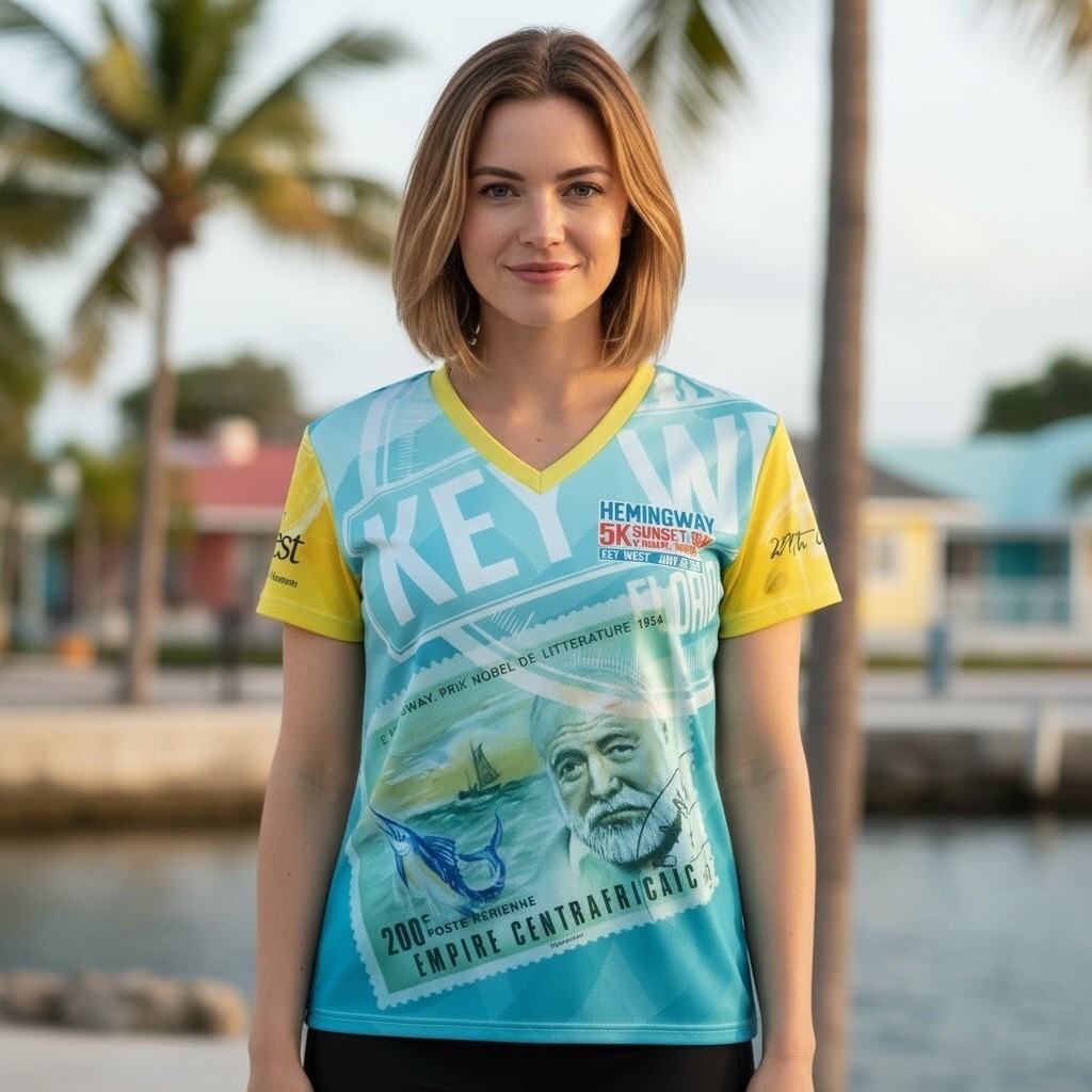 Official event shirt from the Hemingway 5K Sunset Run held in Key West in July 2017. This lightweight performance tee features a full sublimation graphic with Ernest Hemingway artwork, Key West imagery, and race branding on both front and back. Designed for breathability and comfort, it has a V-neck cut and athletic fit. A great collectible for runners, Key West fans, or Hemingway memorabilia collectors.