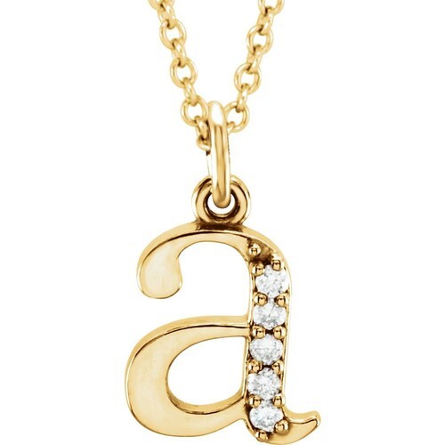 This elegant lowercase initial "A" pendant is crafted from 14K Yellow Gold, offering a sleek and stylish design. The pendant measures 10.5x5.9 mm and is polished to a smooth finish, creating a sophisticated look. It features 0.03 CTW of round-brilliant cut natural white diamonds, graded G-H for color and I1 for clarity, adding a delicate sparkle for extra glam. The pendant suspends from a 16-inch cable chain, secured with a spring ring clasp for a comfortable and secure fit. Weighing approximately 1.54 grams, this piece is a timeless, personalized accessory suitable for any occasion.