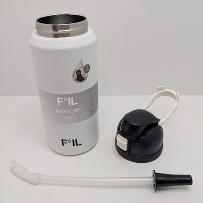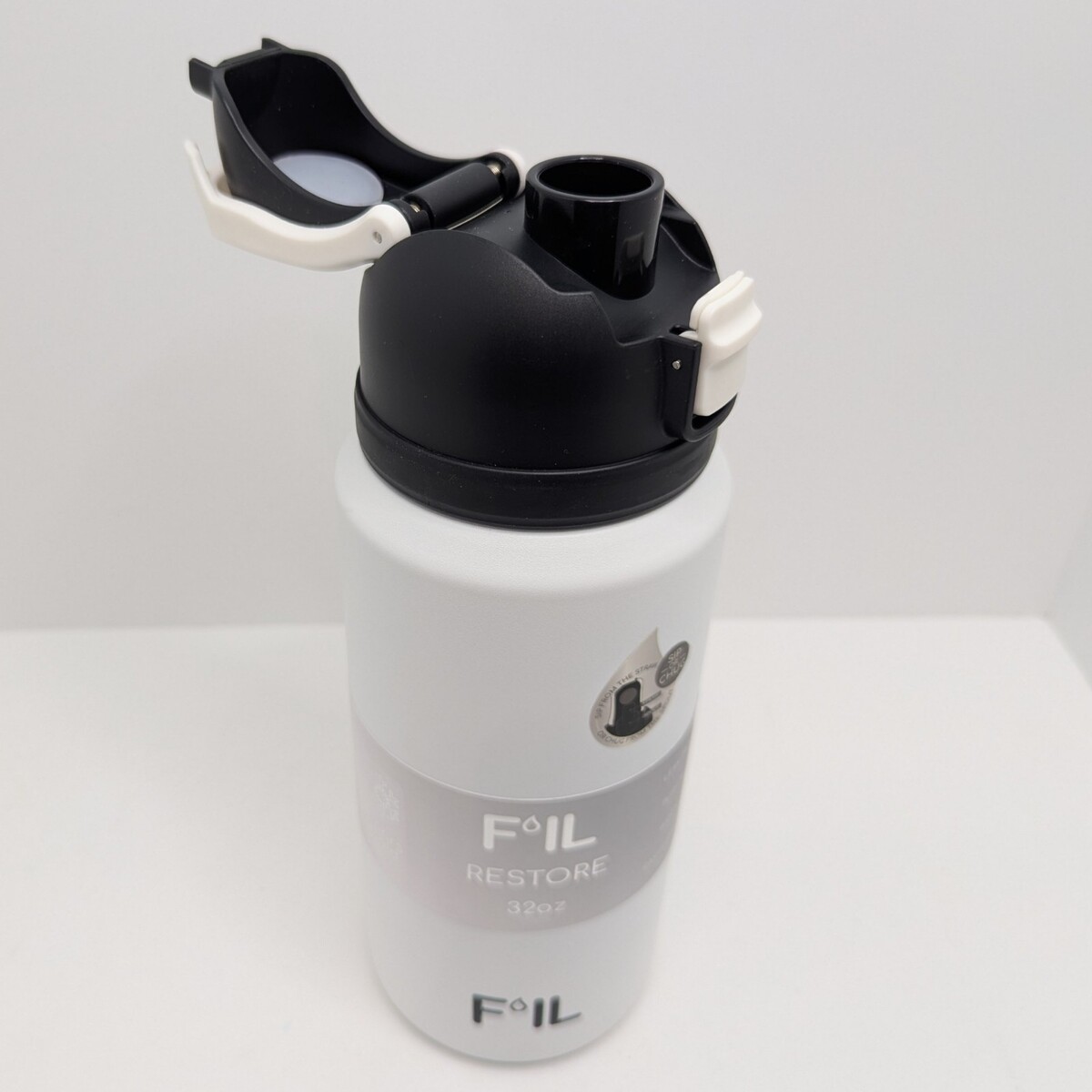 Hydrate your way with the F?IL Restore 32 oz Stainless Steel Water Bottle in Black White Designed for versatility and performance, this bottle lets you sip through the straw or chug from the spout, all while keeping drinks cold for up to 24 hours thanks to double-wall vacuum insulation. Ideal for workouts, travel, school, or everyday use.