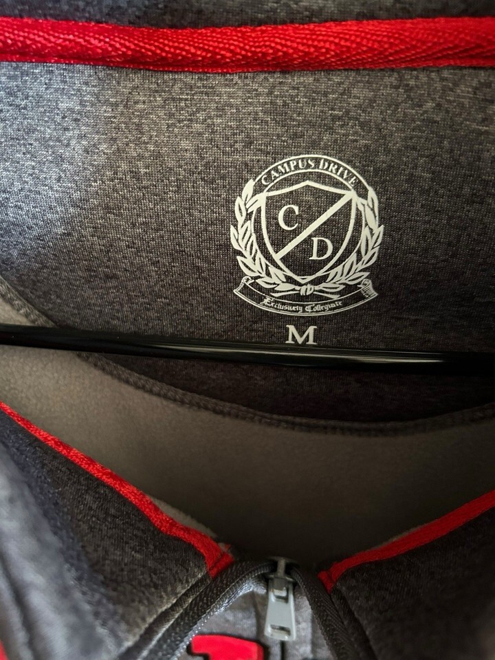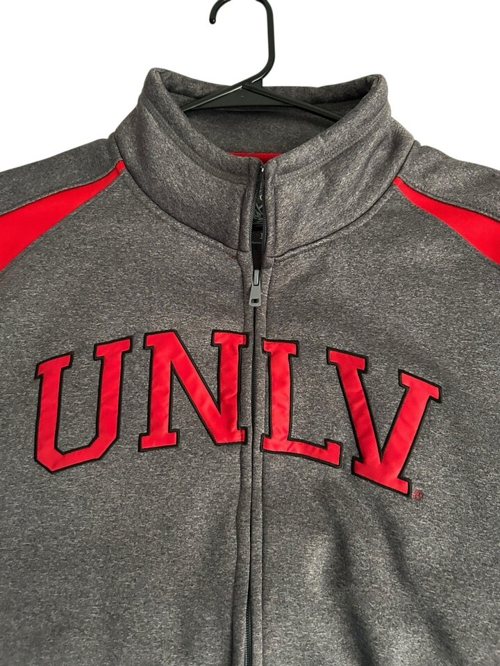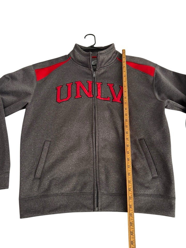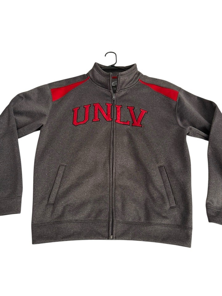 The CD Campus Drive UNLV Rebels High Neck gray Sweatshirt is a men's size M full zip jacket perfect for basketball fans looking to support their favorite team in style. Made with a comfortable gray color, this sweatshirt features the iconic UNLV Rebels team logo, making it a must-have for any fan wanting to show their team spirit during the regular season. Stay warm and stylish while representing the UNLV Rebels with this collegiate apparel.