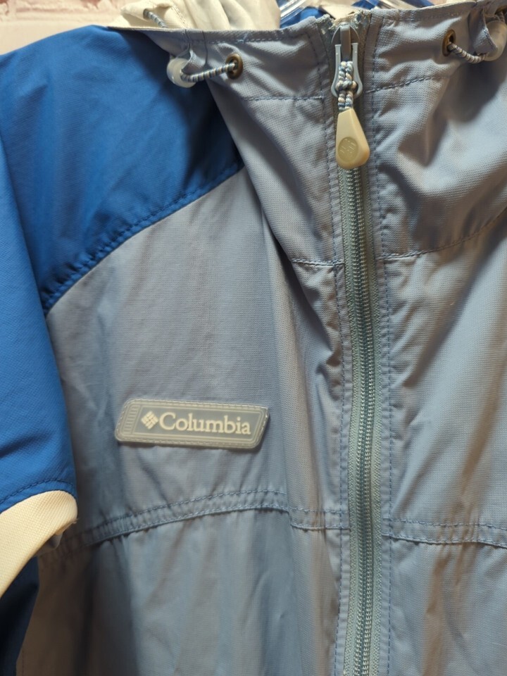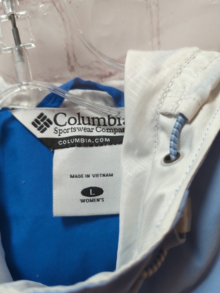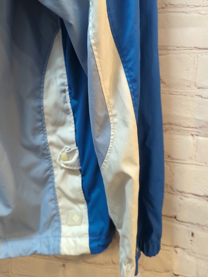 Columbia jacket Women's blue white L windbreaker hooded vented tapered waist