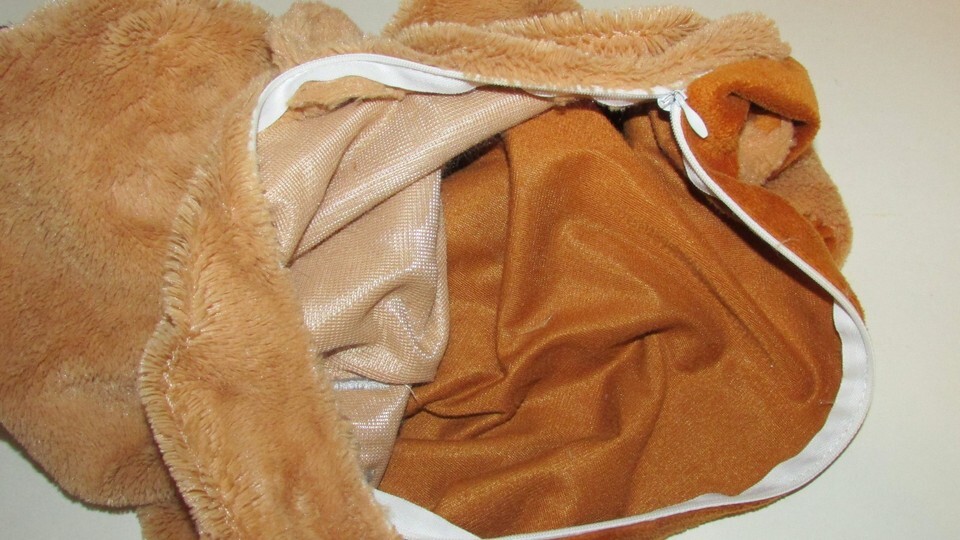 Tan brown flat puppy dog zipper bottom pajama blanket pillow holder mesh pockets