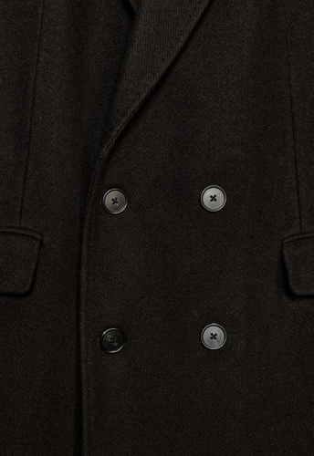 Oversize brown coat made from a wool-blend yarn. Features a notched lapel collar and long sleeves. Front flap pockets. Inner lining. Double-breasted front button fastening.