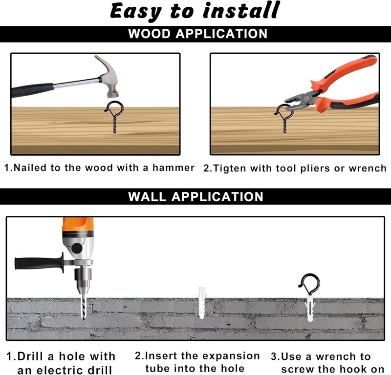 Screw hooks are suitable for various purposes, such as outdoor string lights, hanging plants, and so on.
