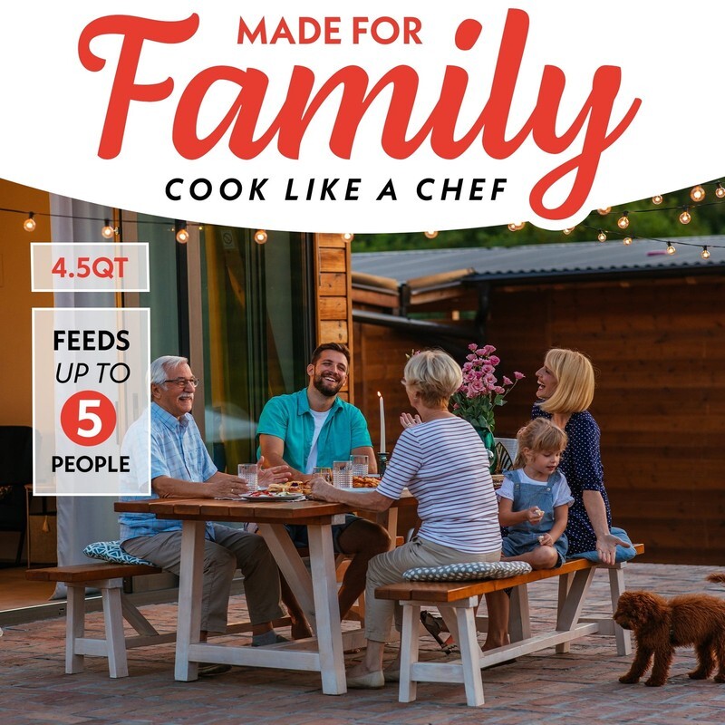 Compact electric crock pot with five one-touch cooking presets Programmable timer ranges from 30 minutes to 24 hours Automatic Keep Warm mode keeps meals hot until ready to serve Removable stoneware pot and locking glass lid are dishwasher safe 4.5-quart capacity ideal for families, meal prep, or one-pot dinners Energy-efficient 210W slow cooking performance in a countertop-friendly size