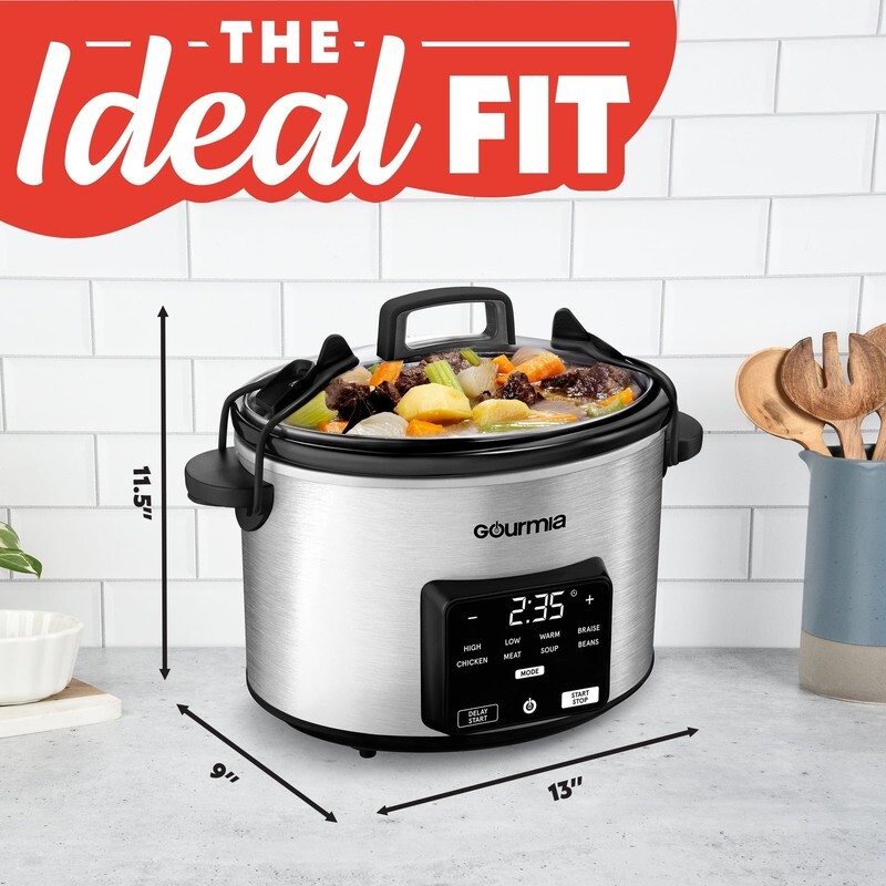 The Gourmia 4.5-Qt Programmable Slow Cooker is a compact electric crock pot that simplifies everyday cooking. Choose from five one-touch presets for braise, chicken, meat, soup, and beans, or customize your cook time from 30 minutes to 24 hours with the programmable timer. An automatic Keep Warm mode maintains perfect serving temperature, while the spill-proof locking lid makes this slow cooking pot great for travel or meal prep. The removable stoneware pot and glass lid are dishwasher safe, offering easy cleanup and convenience for busy kitchens.