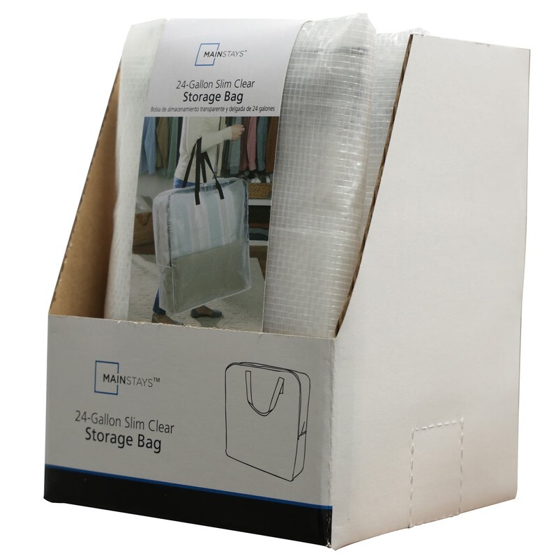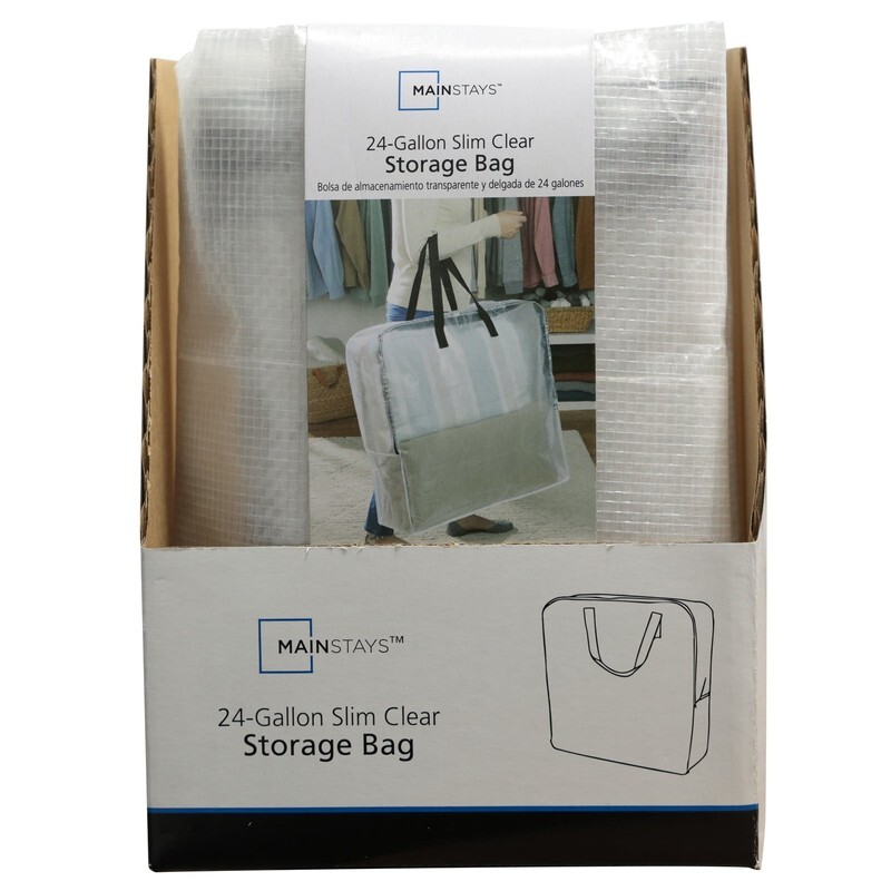 The Mainstays Heavy Duty Clear 24 Gallon Storage Bag is made from durable 180 GSM polypropylene material, built to endure daily use. It features dual carry handles for easy transport, making it perfect for storing or moving everything from kids' to adult clothing, bedding, toys, and other household items. With its generous size of 24.8" x 8.7" x 24.8" and a weight capacity of up to 60 pounds, this bag is ideal for storing seasonal clothing, bedding, or even for use during your next move. The zipper closure wraps around the sides, offering easy access to the contents.