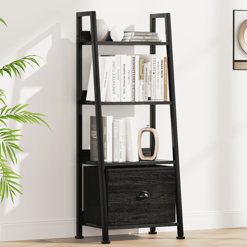 4-Tier Ladder Bookshelf with Drawer, Leaning Bookcase Storage Display Shelf, Black Oak